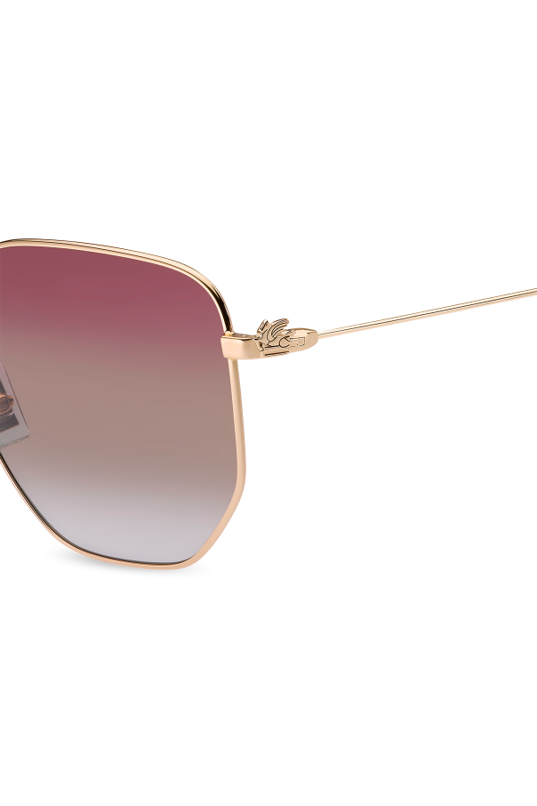 Introducing the epitome of sophistication and allure in eyewear: Etro\'s Gold-Tinted Sunglasses. These sunglasses, with their large, square lenses that cascade from a golden hue at the top to clear at the bottom, exemplify luxury and style. The frames are a masterpiece of minimalism, crafted from 100% metal with thin, gold-colored arms that gracefully embrace the wearer\'s face. Unique to this design, delicate engravings on the temples serve as a hallmark of the esteemed Etro brand, elevating these sunglasses to a symbol of fashion prestige. The exquisite detailing, evident in the refined wing or leaf pattern on the arm, showcased in one of the accompanying images, distinguishes these sunglasses from any other. This intricate motif not only accentuates the golden tones of the metal but also signifies the brand\'s commitment to elegance and unmatched quality. Accompanied by a luxurious, brown leather-like case, these sunglasses promise not only unparalleled style but also protection and durability. Whether viewed on the visage or nestled within their case, these sunglasses command attention and admiration, making them a must-have accessory for those who covet fashion that speaks volumes without uttering a single word. Why Purchase These Sunglasses? Luxurious Design: Minimalist yet opulent, with gold accents and unique engravings that set them apart. Exclusive Branding: The distinctive Etro engraving adds an element of exclusivity and brand recognition. High-Quality Materials: Crafted from 100% metal, ensuring durability and a premium feel. Protective Features: Equipped with rose-tinted UV protection lenses, blending functionality with fashion. Complementary Case: Comes with a sophisticated, brown case, enhancing the product\'s luxury appeal.
