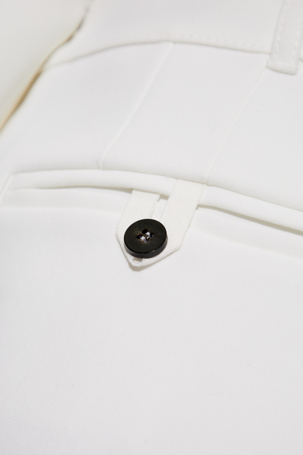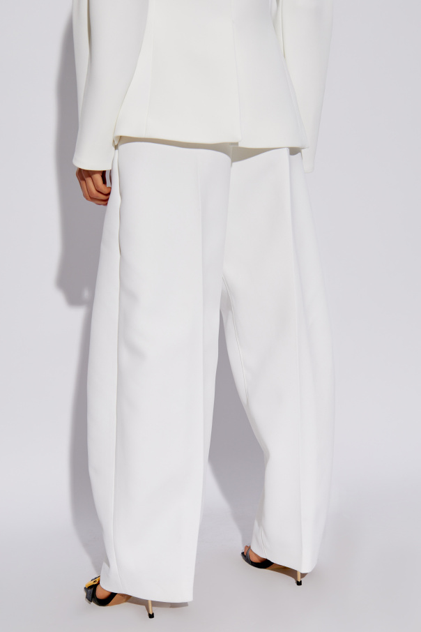 Introducing the \'Ovalo\' trousers, a quintessence of sophistication and effortless elegance, meticulously designed by the renowned Jacquemus. Exemplifying high-fashion finesse, these trousers are crafted from a premium blend of 97% cotton and 3% elastane, providing both comfort and a flawless finish. The dominant crisp white color exudes universality and elegance, making it an impeccable choice for diverse styling options. Characterized by their spacious, straight-leg silhouette with distinctive pleats, the \'Ovalo\' trousers offer a relaxed yet refined fit that caters to the modern connoisseur of fashion. The inclusion of a striking dark button on a strap/belt, contrasting beautifully against the trousers\' white canvas, adds a touch of intrigue and versatility, whether as a decorative element or a functional closure. Practicality is woven into the design, featuring three pockets - two side-entry pockets and one buttoned pocket, alongside belt loops for an adjustable fit. The trousers are secured with a zip, button, and hook fastening, ensuring ease of wear without compromising on style. The wide-leg design not only enhances the visual appeal but also promises unparalleled comfort. Why invest in the \'Ovalo\' Trousers? Exquisite Craftsmanship: Designed by Jacquemus, a symbol of luxury and innovative design. Luxurious Material: High-quality cotton blend for durability and smooth texture. Unique Details: Eye-catching contrast button and pleats for a distinguished look. Versatile Styling: The timeless white hue pairs seamlessly with various outfits, suitable for multiple occasions. Comfort and Fit: Relaxed silhouette with adjustable features for a custom-fit experience.