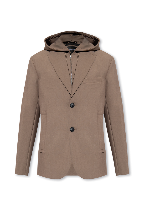 Brown single-breasted blazer from Emporio Armani. With a detachable panel featuring a drawstring hood and two-way zipper, this style employs a single back vent, button closures, notch lapels, three slip pockets and long sleeves.
