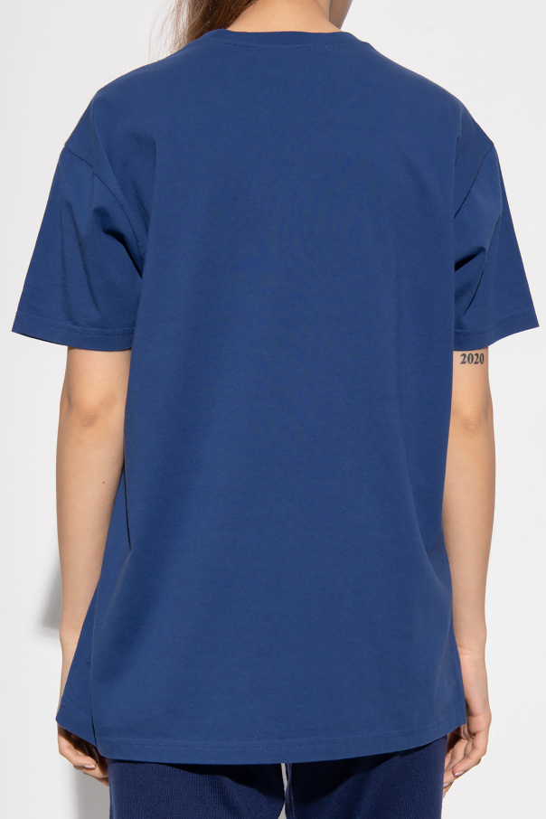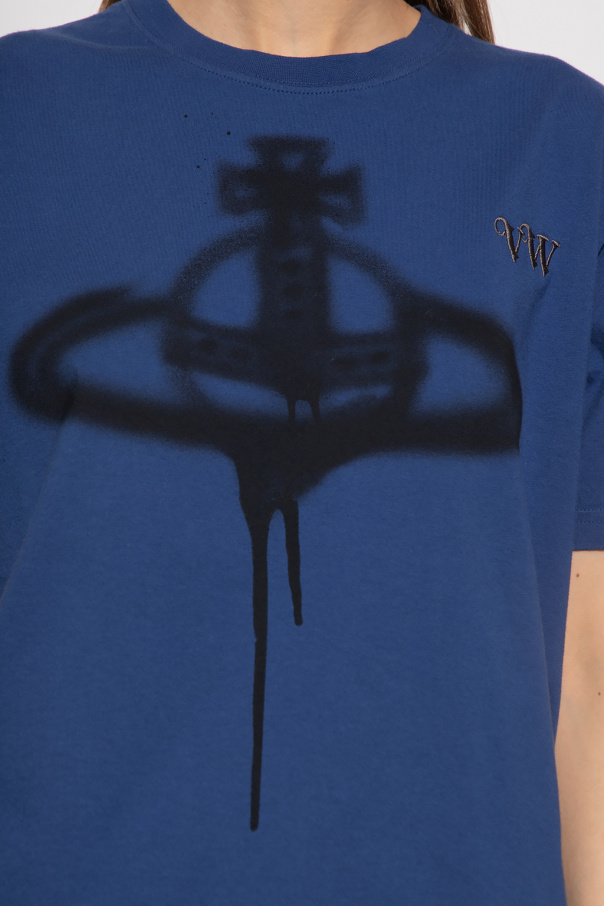 Dark blue crewneck T-shirt from Vivienne Westwood. Crafted from organic cotton, this style features short sleeves and the designer\'s logo embroidered and printed in grey and black on the front.