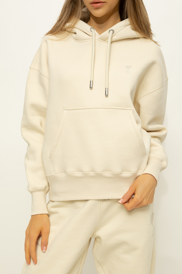 Cream sweatshirt with a drawcord-adjustable hood from Ami Alexandre Mattiussi. Crafted from a fabric blend including organic cotton with the GOTS certificate and recycled material, this style showcases ‘Ami De Coeur’ embroidery on the front, the designer\'s logo at the back, a kangaroo pocket, raglan sleeves and ribbed trims on the edges.