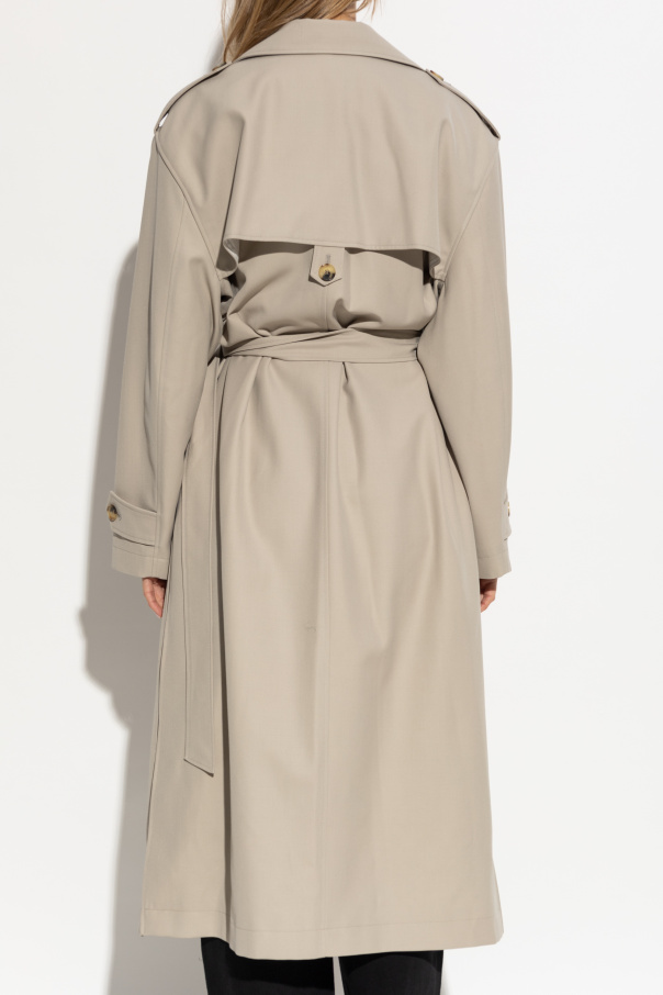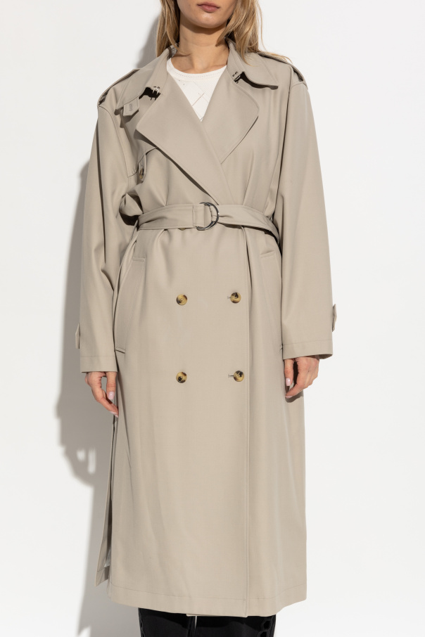 Introducing the Kalana Trench by Iro, an epitome of classic elegance and modern versatility. This exquisite trench coat, in a timeless beige hue, showcases a long, tailored silhouette, accentuated by a double-breasted button closure. The belt with a buckle cinches the waist, creating a flattering shape. Noteworthy details include large, contrasting buttons, a wide collar with lift capability, and shoulder epaulettes that add a distinctive flair. The sleeves feature adjustable buttoned straps, while the back boasts a traditional vented flap, ensuring both style and comfort. Crafted from a smooth-textured fabric, the outer layer combines polyester and wool, promising wind and water resistance. The inner lining, a blend of viscose and cotton, assures luxurious comfort. Styled seamlessly with a casual ensemble—white sweater, black pants, and sneakers—this trench transitions effortlessly from sophisticated to everyday chic, embodying the brand\'s Parisian-inspired elegance. Why Choose This Product? Classic, double-breasted design with a modern twist. High-quality materials for durability and comfort. Stylish details like epaulettes and adjustable sleeves. Versatile styling options for various occasions. Designed by Iro, a brand synonymous with Parisian chic.