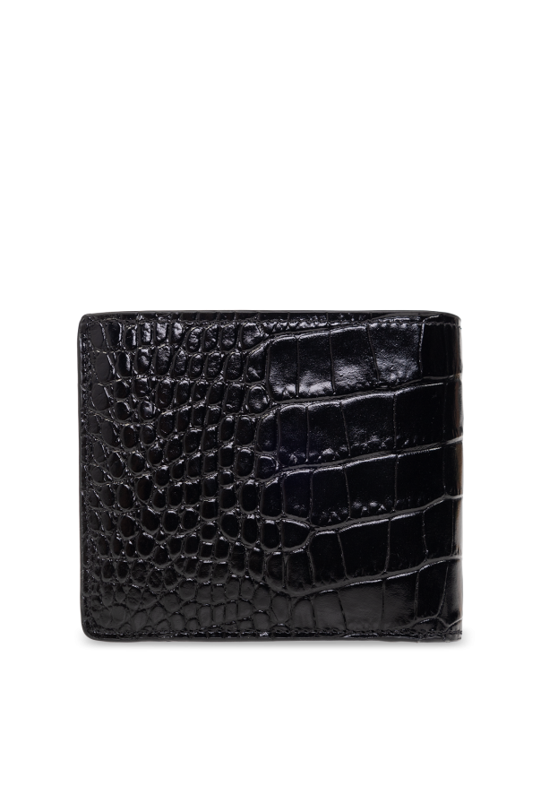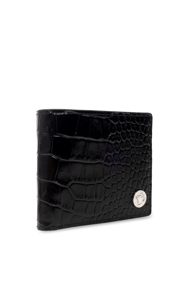 Black folding wallet from Versace. Made from leather with a crocodile skin effect, this item features a silver-tone application with the brand\'s signature Medusa face on the front and two bill compartments, one snap-fastened coin pocket and three card slots inside.
