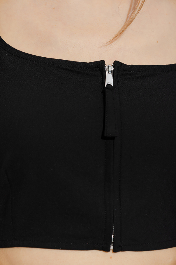 Black top from Ganni. Crafted from a blend of LENZING™ECOVERO™ viscose and recycled material, this style features a square collar, front zipper and elasticized trims on the puff short sleeves and bottom hem.