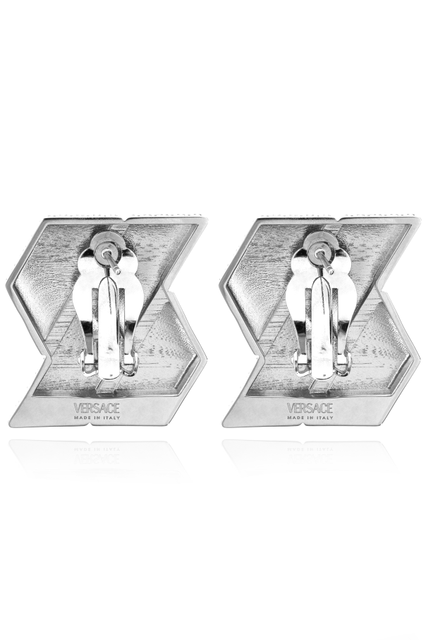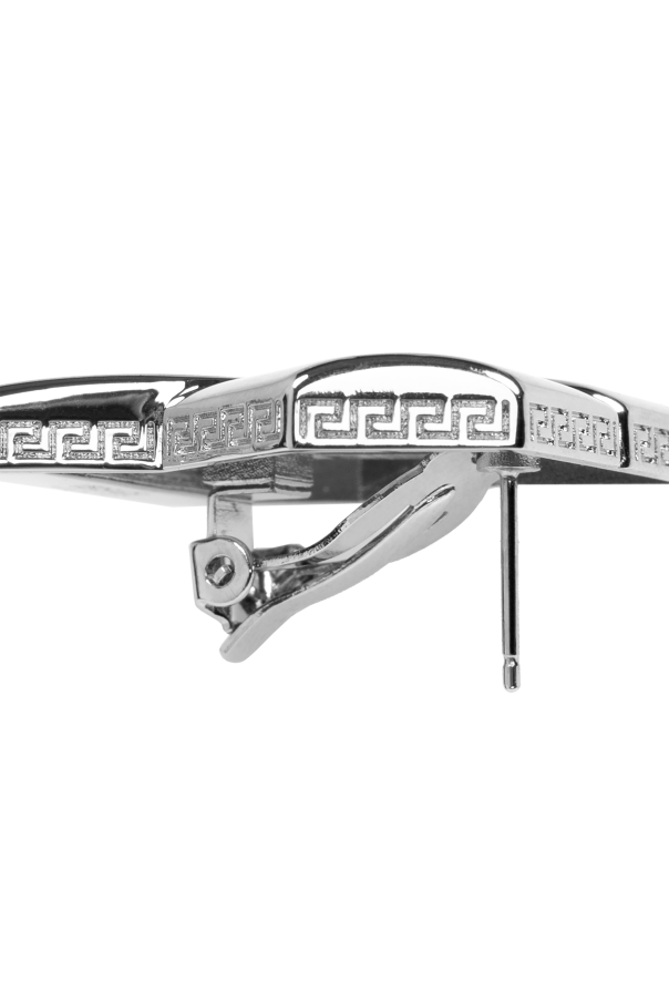 Introducing the Kolczyki ze wzorem greckim, an exquisite addition to your jewelry collection. These earrings from the illustrious Versace house embody the perfect blend of classical Greek motifs and contemporary design. Crafted meticulously from premium silver-tone metal, these earrings feature a unique, geometric shape comprising two interconnected rhombuses, creating a striking three-dimensional effect. The edges are adorned with the iconic Greek key (meander) pattern, showcasing the impeccable craftsmanship and artistic inspiration drawn from ancient Greece. The earrings boast a polished, high-gloss finish, enhancing their luxurious and modern appeal. Each piece is equipped with a clip-on fastening for ease of wear and is engraved with the renowned Versace logo on the reverse, affirming their exclusivity and authenticity. Designed to make a statement, these substantial earrings are showcased on the ear, highlighting their bold and elegant presence. Why Buy This Product? Exclusive Design: Unique geometric shape with Greek key pattern. Premium Material: Made from high-quality silver-tone metal. Luxurious Finish: Polished to a high-gloss shine. Designer Authenticity: Features Versace\'s signature logo. Ease of Use: Convenient clip-on fastening. Statement Piece: Large size for a bold, fashionable look.