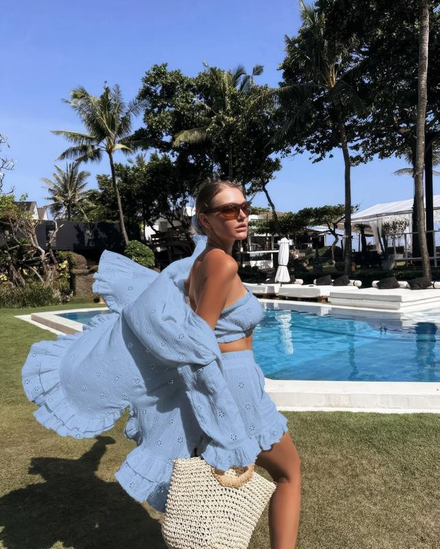 ▫️ Размер: 42-44, 44-46Потрясающий костюм тройка из прошвы в цветок. Легкая дышащая ткань. Топ и шорты на резинке, рубашка oversize, с вырезами по бокам. Очень актуальная модель, стильный готовый образ.