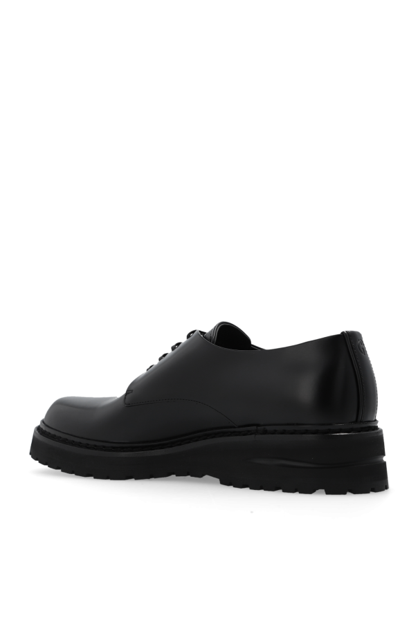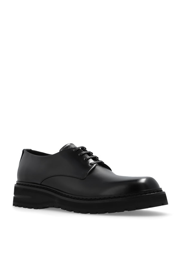 Black shoes from Giorgio Armani. Made of leather, this lace-up model sits on a black rubber sole and features an embossed logo on the tongue.