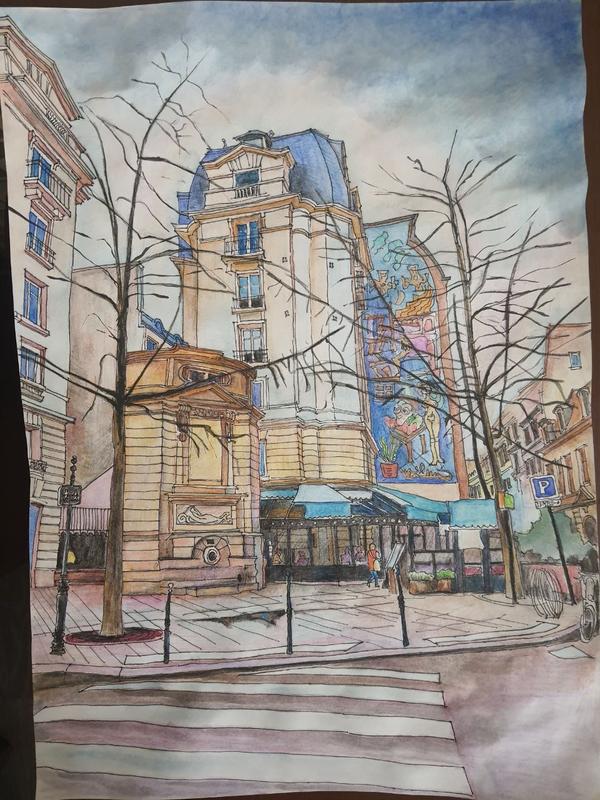 Картина міста. Картина з архітектурою і мурлом, стінописом в Парижі. Виконаний аквареллю, розмір 30*40 см ручна робота в рамці або без.