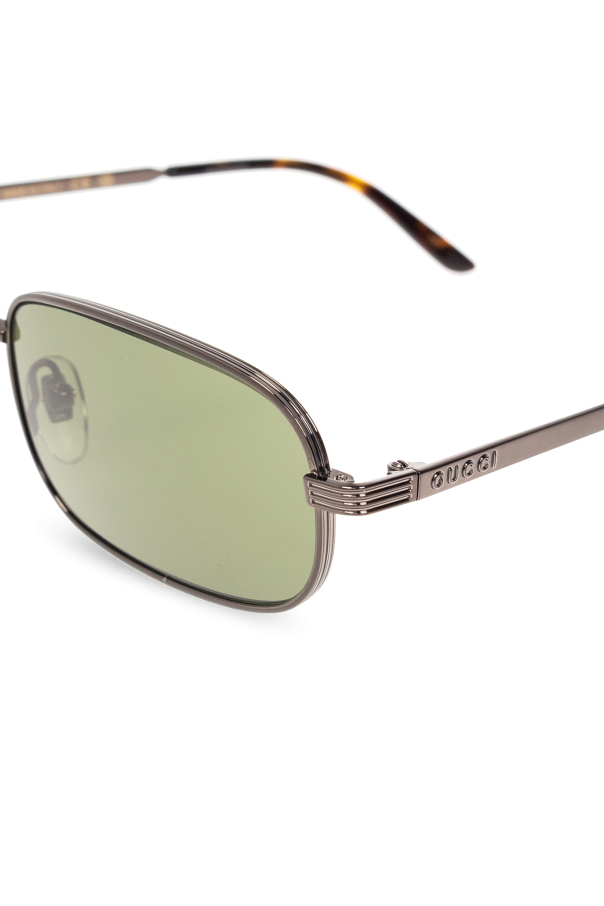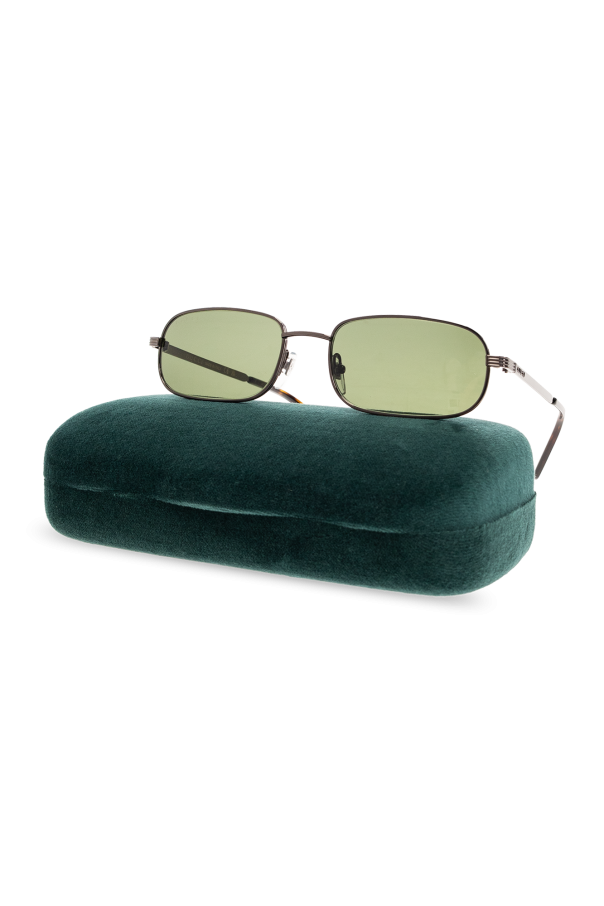 Dark silver-tone sunglasses from Gucci. This pair features a rounded rectangular frame, engraved logo on the temples and green lenses with 100% UV protection. The color of the case is chosen individually for each pair of glasses.