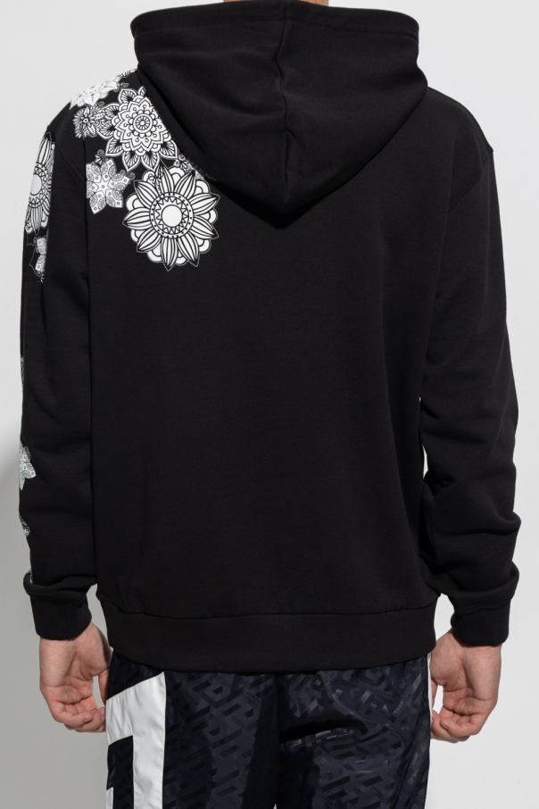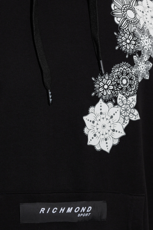 Black sweatshirt with a drawcord-adjustable hood from John Richmond. Crafted from cotton jersey, this style features a white graphic print, a logo patch, a kangaroo pocket and a ribbed bottom hem and cuffs.