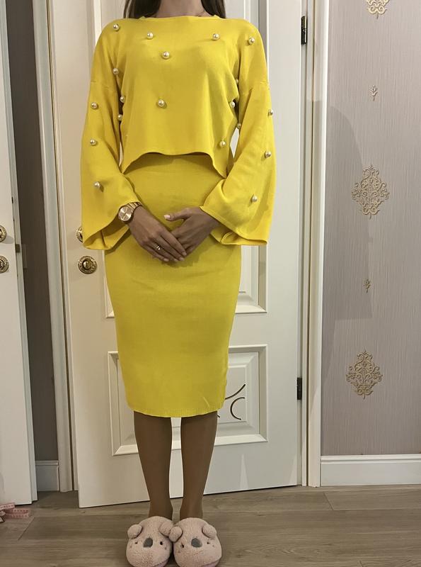 Яркий крутой трикотажный костюм, на кофте есть также декор в виде жемчуга. Насыщенный цвет, не одевался ни разу, но без бирки.