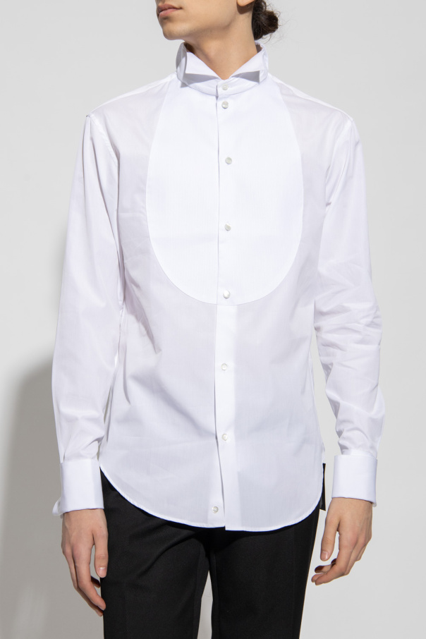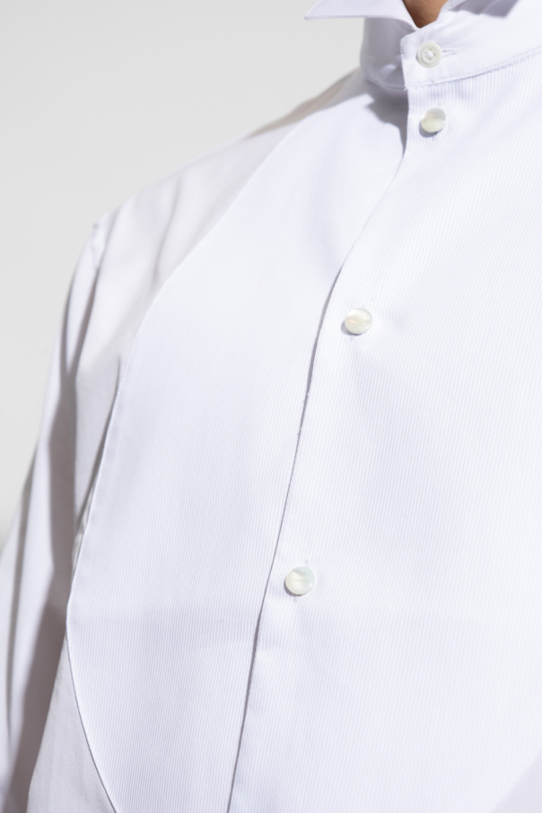 White shirt from Emporio Armani. Crafted from cotton, this garment features decorative buttons, ribbed panel in white and cufflink cuffs.
