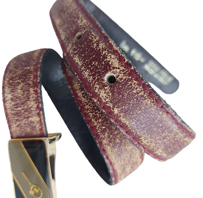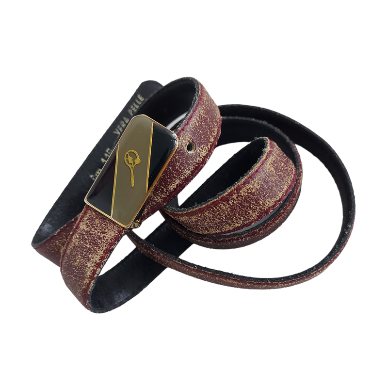 Материал: Натуральная толстая и гибкая кожа, очень приятная на ощупь, верхний слой имеет кракелюр от времени, что придает винтажный шарм. Пряжка из тяжелого металла золотого цвета, имеет глазированный верх с изображением теннисной ракетки и гвоздя-застежку из задней части