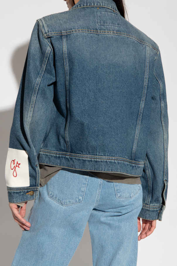 Dark blue denim jacket from Golden Goose. Embellished with the brand\'s signature metal stars at the back, this style features a vintage effect, a cropped fit, button fastenings, two slip pockets, two flapped pockets with buttons, long sleeves and the signature patch with red logo embroidery on the cuff.