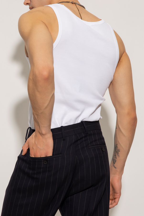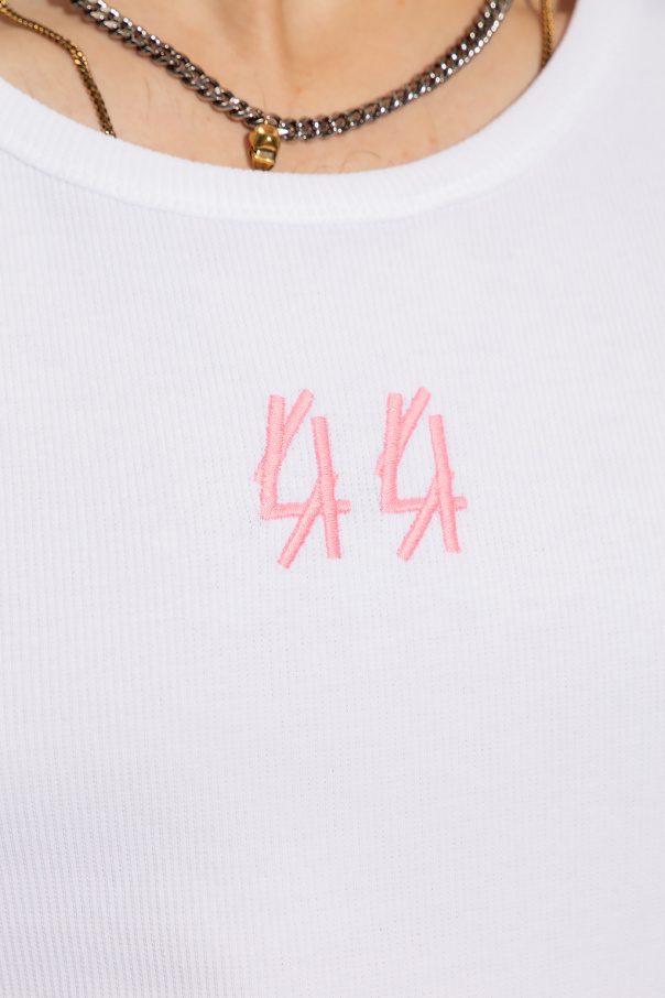 White sleeveless crewneck T-shirt from 44 Label Group. Made of cotton with a ribbed texture, this style showcases an embroidered pink logo on the front.