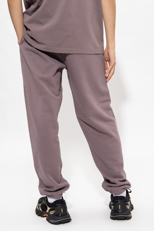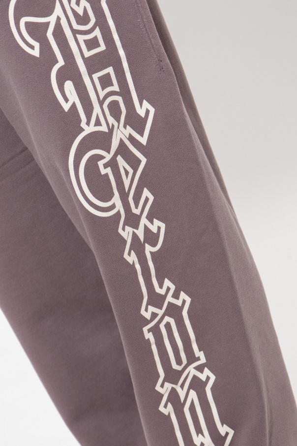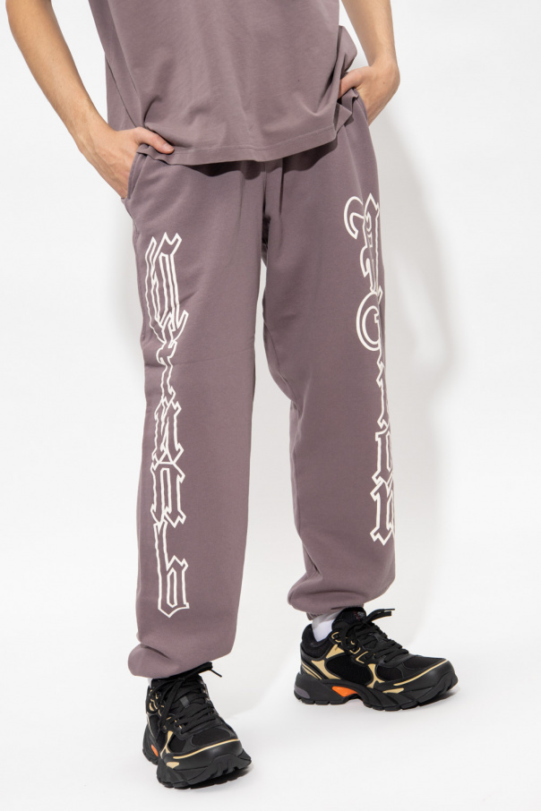 Grey sweatpants from Heron Preston. Crafted from cotton, this pair features a drawstring waist, elasticated cuffs, two frontal pockets and a white graphic print accompanied by an orange logo patch.