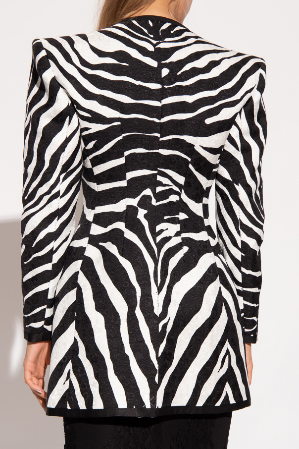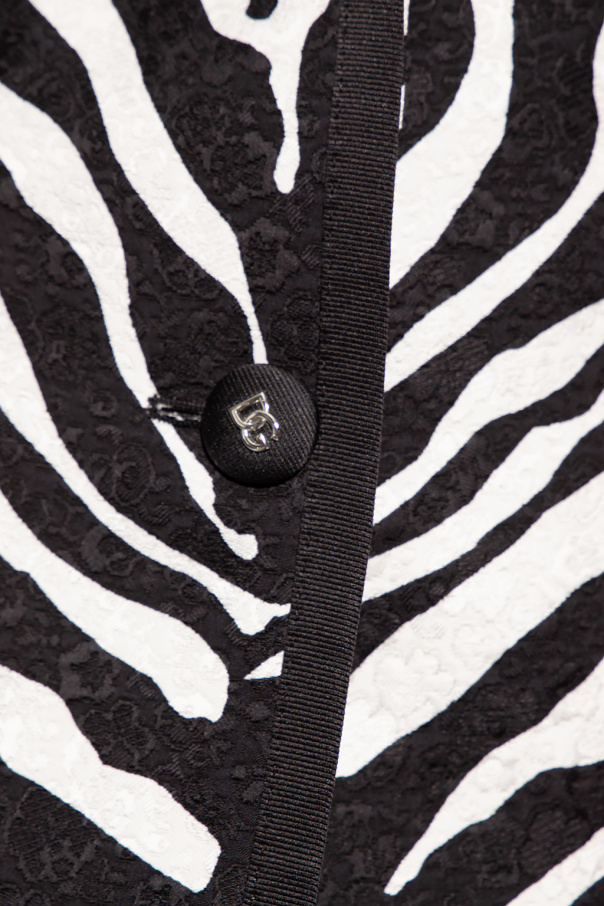 White and black single-breasted blazer from Dolce & Gabbana. This fitted design features decorative buttons with logo appliqués, jacquard pattern, animal print, padded shoulders, four slip pockets, single rear vent and black trimming at the round neck, front, long sleeves and hem.