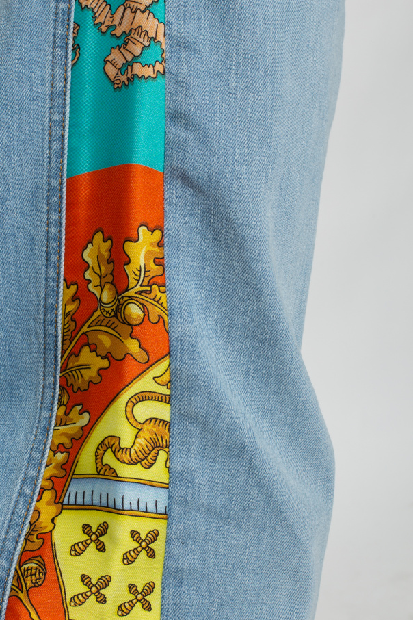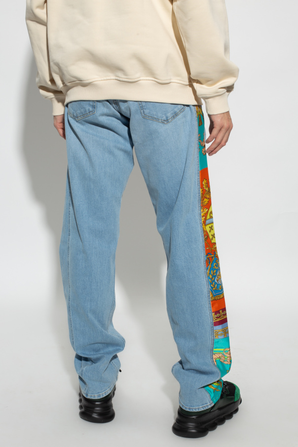 Blue jeans from Versace. Crafted from cotton, this pair falls down with slightly tapered legs and is complete with a zip and button closure, multicolored inserts with the label’s signature Rebellion print and five slip pockets.