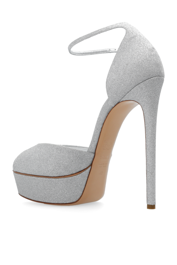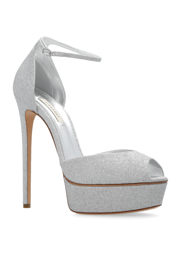 Silver-tone ‘Flora City Light’ platform sandals from Casadei. Fastened with adjustable buckled ankle straps, this pair is embellished with glitter and features an almond toe, high heel and beige leather sole.