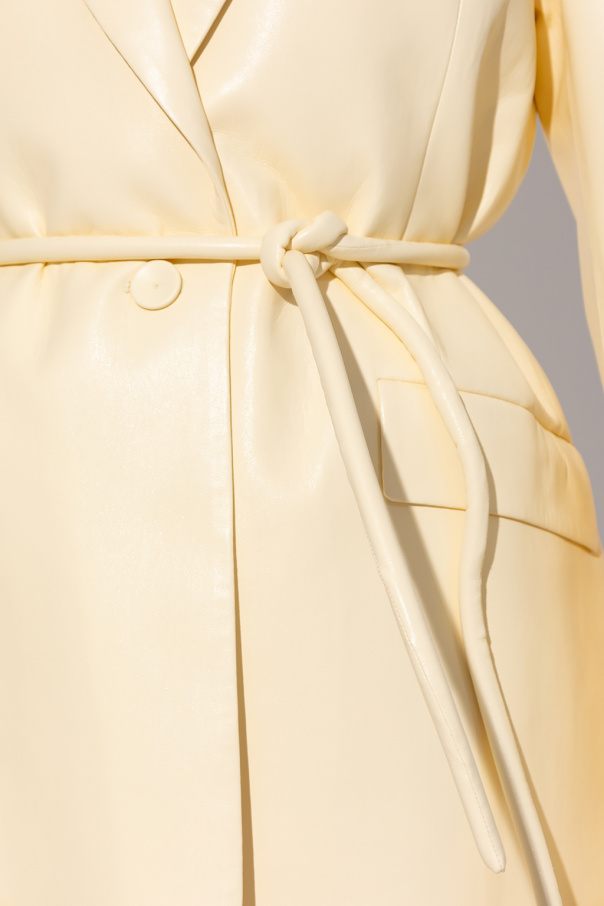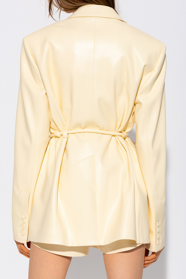 Cream ‘Mariko’ blazer from Nanushka. Made of soft vegan leather, this style features a single-breasted silhouette with button fastenings, a waist-cinching drawstring belt, one slip pocket, two flapped pockets, a single back vent and long sleeves with button cuffs.
