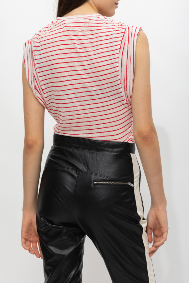 White and red ‘Kottyni’ T-shirt from Isabel Marant Étoile. Made of linen, this short sleeve design features a stripe pattern and ribbed shoulders.
