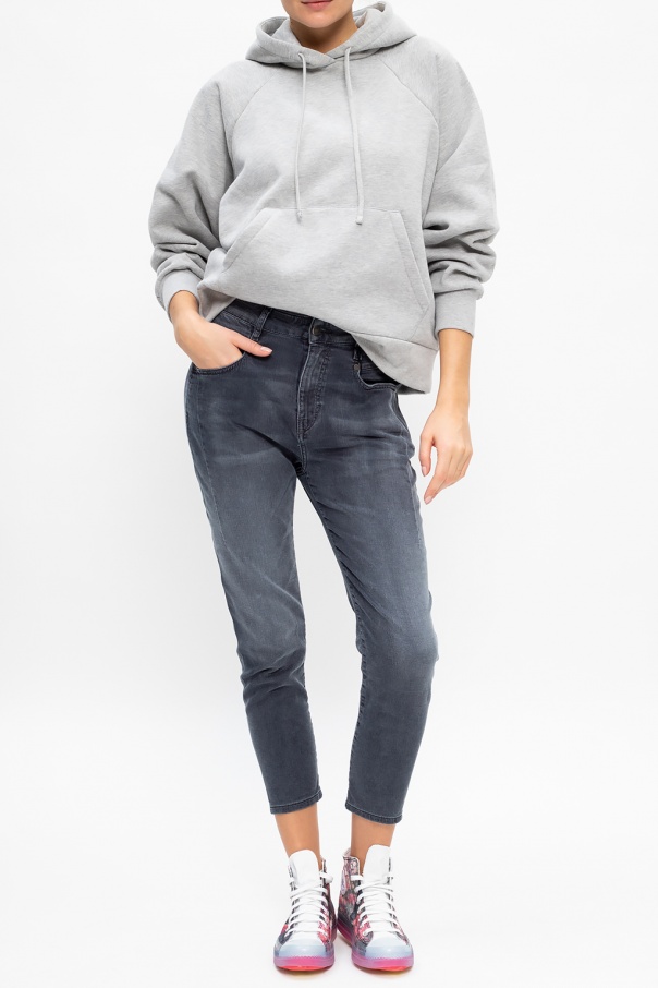 Grey and blue ‘D-Fayza’ distressed jeans from Diesel. Fastened with a zip and button, this tapered leg design features five slip pockets and a black logo patch at the back.
