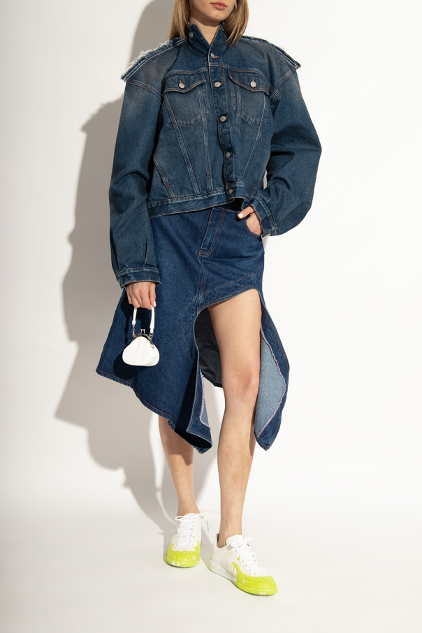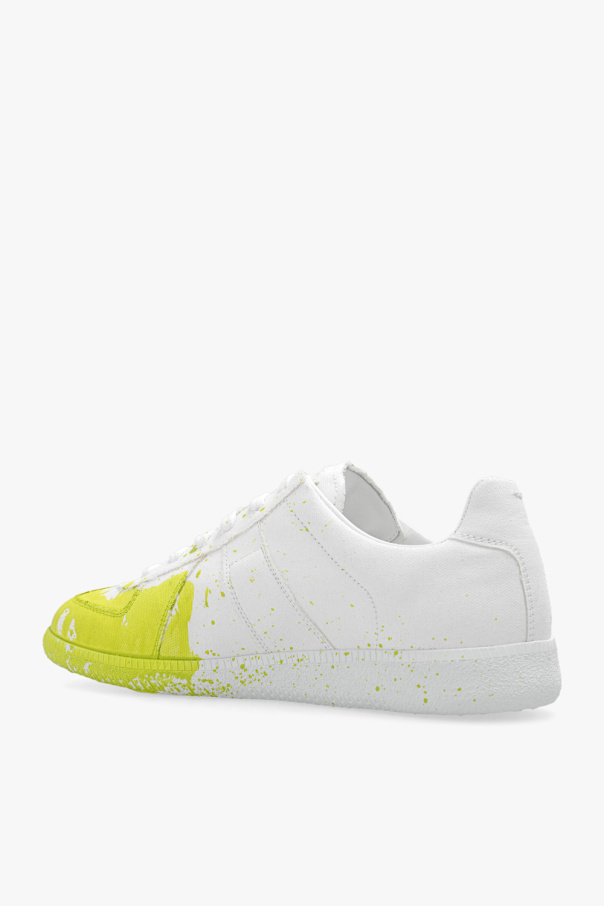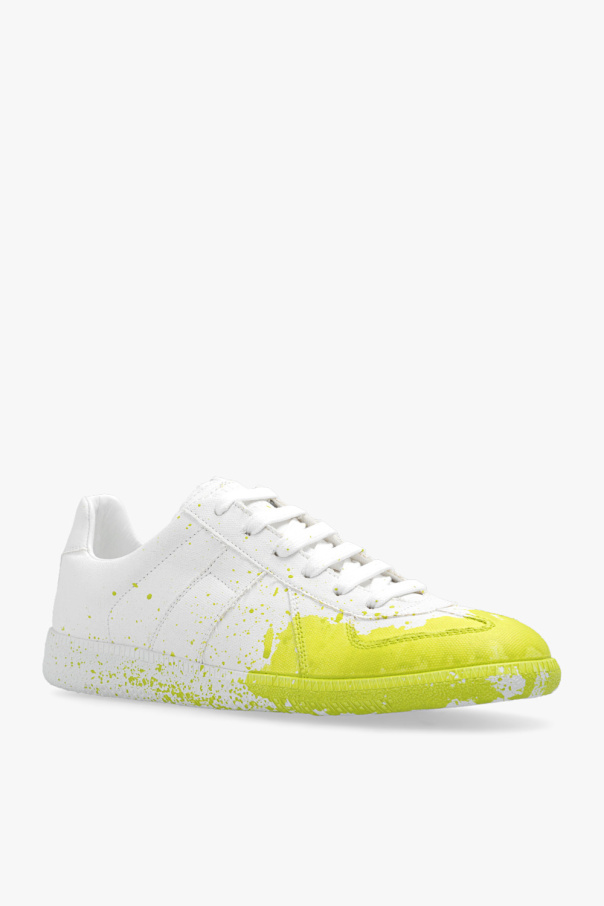 White and yellow sneakers from Maison Margiela. Crafted in part from leather, this lace-up model sits on a white rubber sole and showcases a paint splatter print.