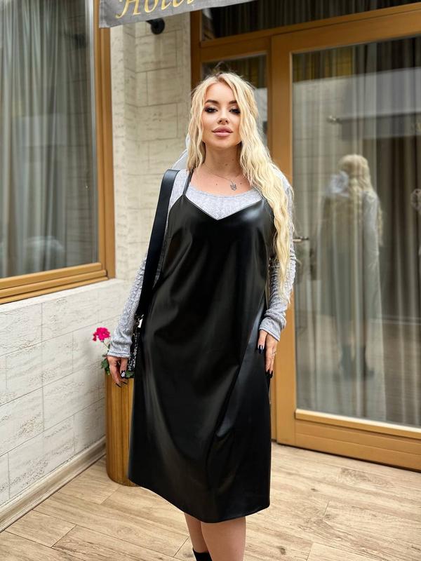 Сарафан выполнен из эко-кожи на тонких бретельках. Шлейки эластичные, поэтому подстраиваются под ваши плечики.