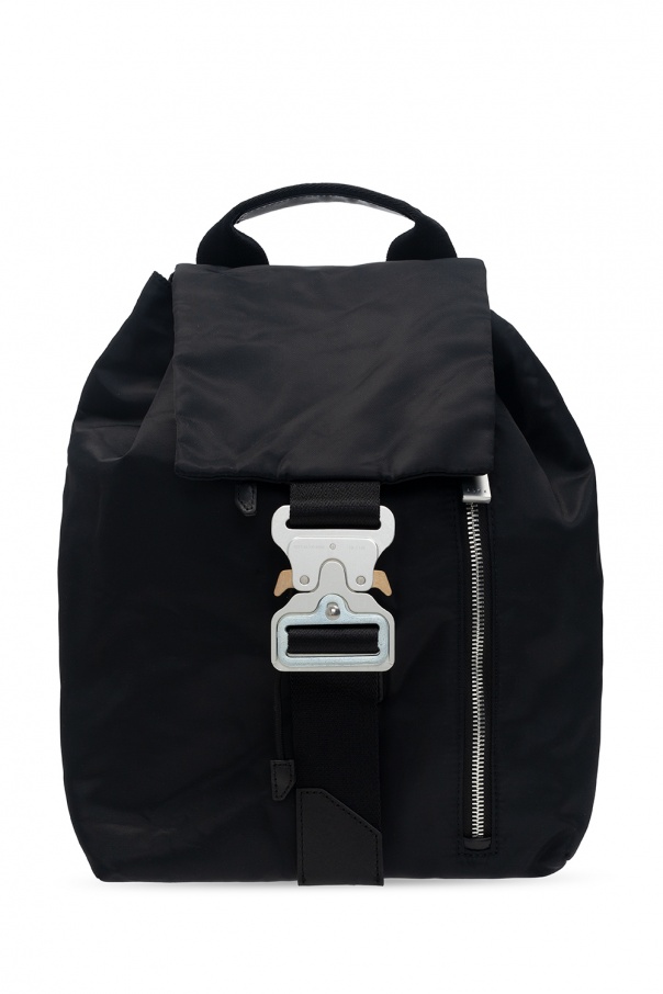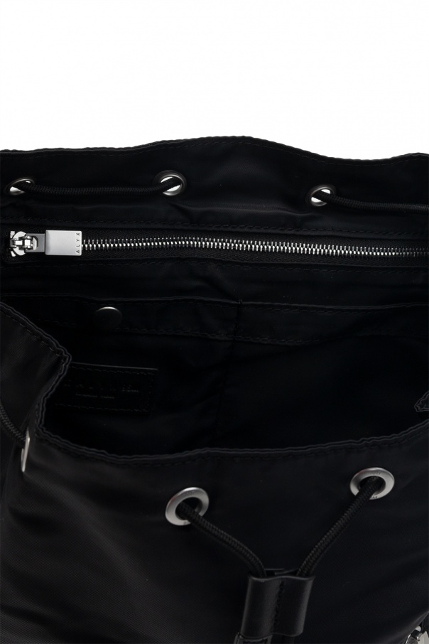 Black backpack from 1017 ALYX 9SM. Fastened with drawstrings, this design features a metal closure in silver-tone and gold-tone, front zip pocket, half-round handle, adjustable shoulder straps, detachable strap and one internal compartment with one zip pocket, one snap pocket and one slip pocket.