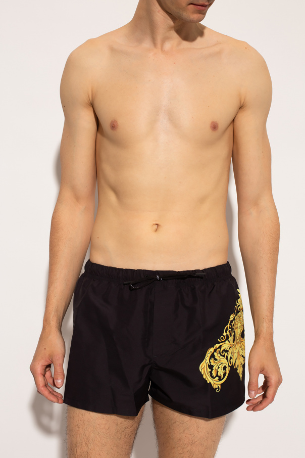 Black swim shorts from Versace. Fastened with drawstrings, this pair features a back pocket as well as the brand’s signature yellow Baroque print and Medusa head.