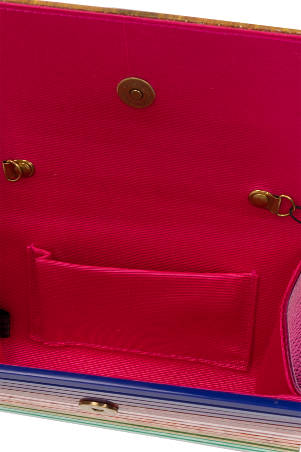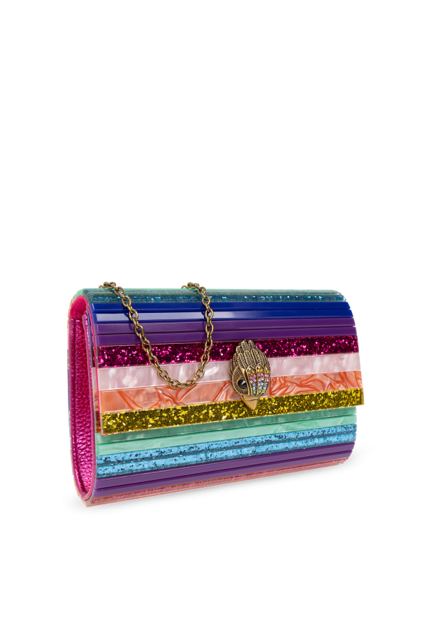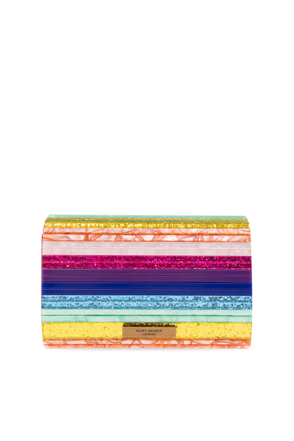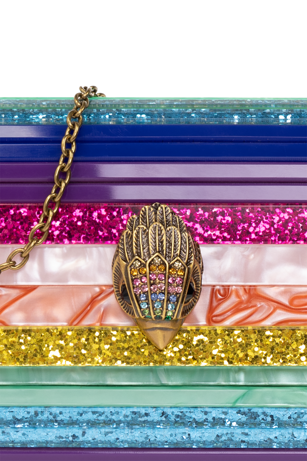 Multicoloured ‘Party’ shoulder bag from Kurt Geiger. Made from panelled plexiglass with a glitter and marble effect, this design secures with a magnetic snap and showcases the brand\'s signature Eagle emblem, encrusted with glossy crystals on the front. It is complete with a logo-engraved application on the back, one detachable chain strap, antiqued gold-tone metal hardware and one internal compartment with a card slot.