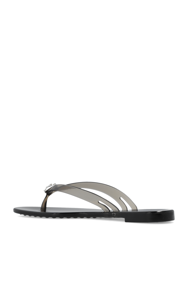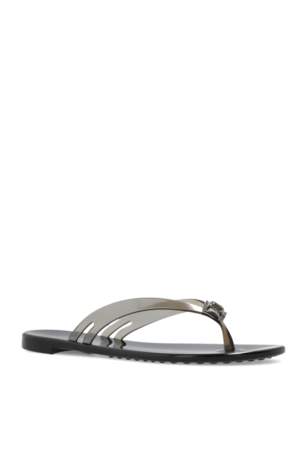 Black ‘Jelly’ flip-flops from Casadei. Made of rubber, this semi-transparent pair features crystals and a black rubber sole.