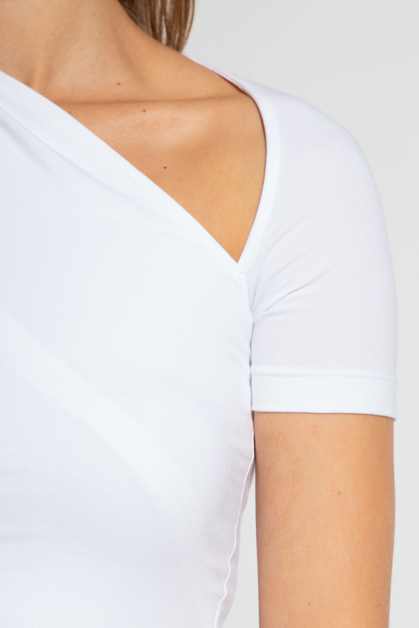 White t-shirt from Helmut Lang. Crafted from a cotton blend, this short sleeve design features a shoulder cut-out and asymmetric neckline.