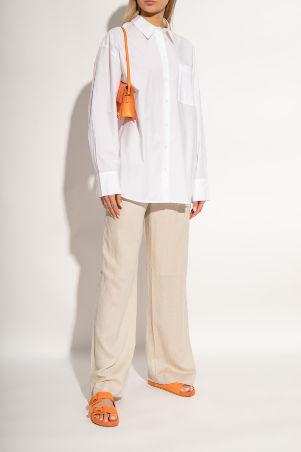 Orange slides from Manebi. Made of suede, this model sits on a light brown rubber sole with a jute overlay and features an embossed logo on the side and adjustable buckle straps.