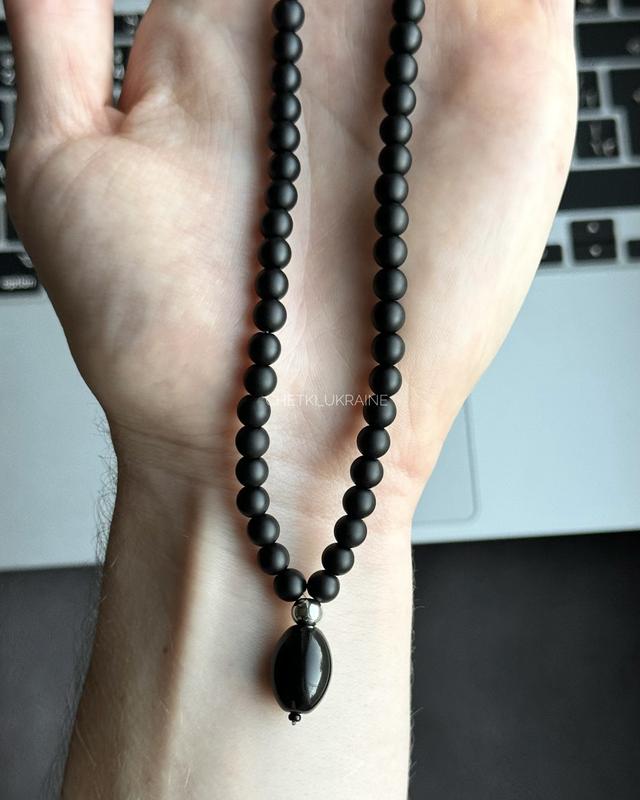 матеріал — чорний онікс 6 мм, ювелірна сталь та еластичний шнур, практичний і довговічний, не перетирається на відміну від ниток