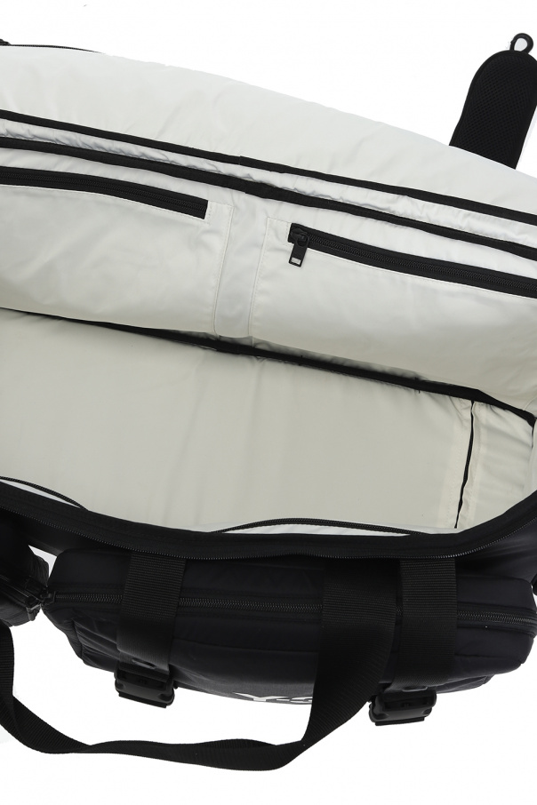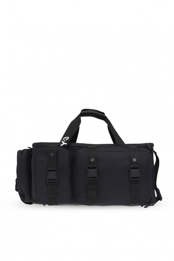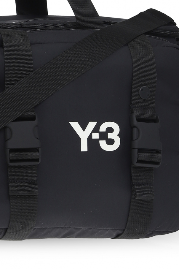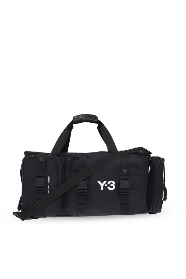 Black Y-3 travel bag from Yohji Yamamoto. Closed with a zipper. Decorated with a white logo print. Six pockets with zippers. Two semicircular handles. Shoulder strap. Decorative buckle fasteners. Inside, a compartment and three zippered pockets. Black metal finish.