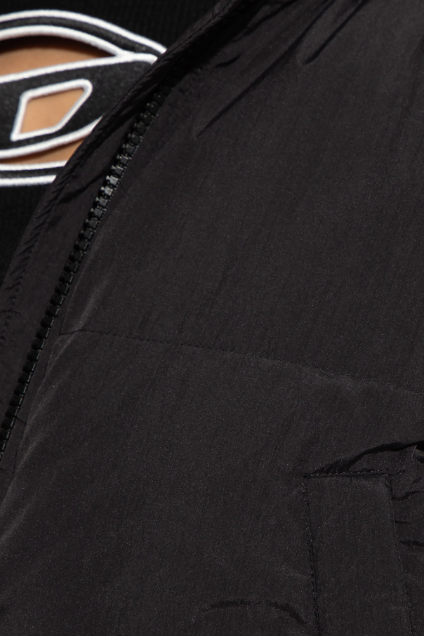 Black ‘W-PEYT-SHORT’ down jacket from Diesel. Emblazoned with a black and white logo patch, this style fastens with a two-way zip and features a detachable hood, two zip pockets, long sleeves and ribbing on the bottom hem and cuffs.