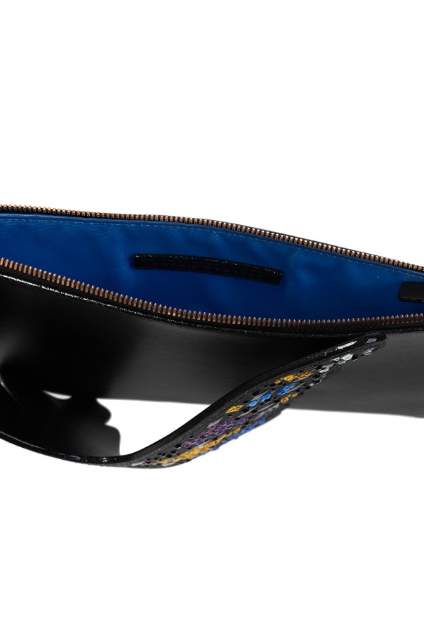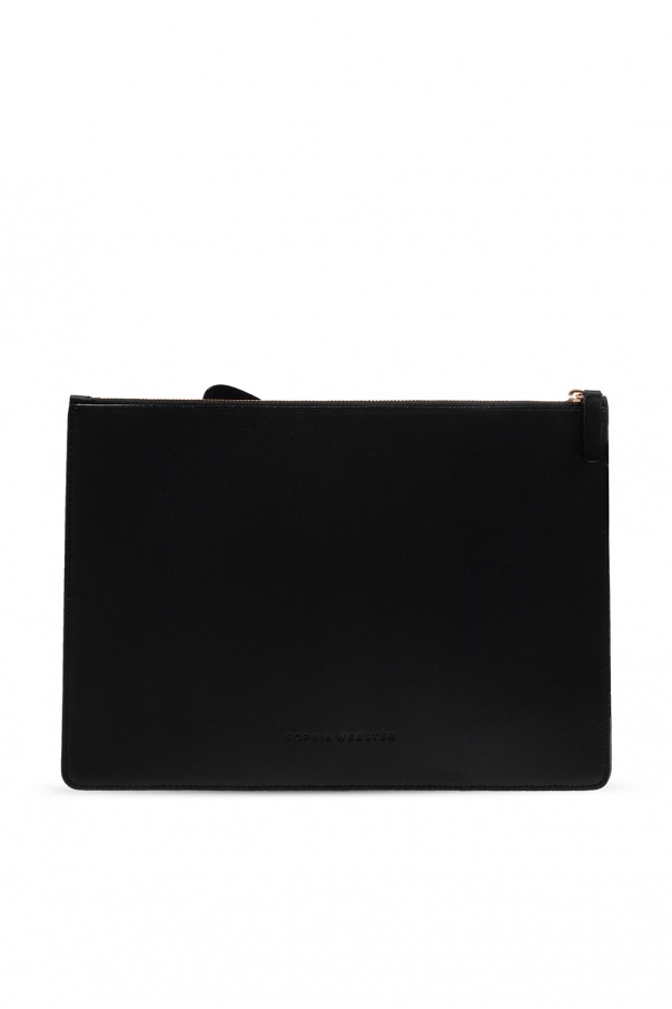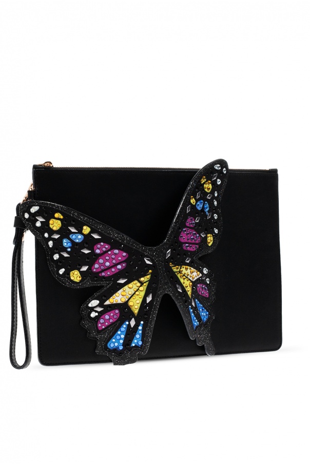 Black ‘Flossy’ clutch from Sophia Webster. Crafted from leather, this model features zip fastening, an embossed logo and the brand’s signature butterfly wing motif embellished with colorful elements and glitter. It is complete with a detachable wrist strap with a snap hook, blue lining and one internal compartment.