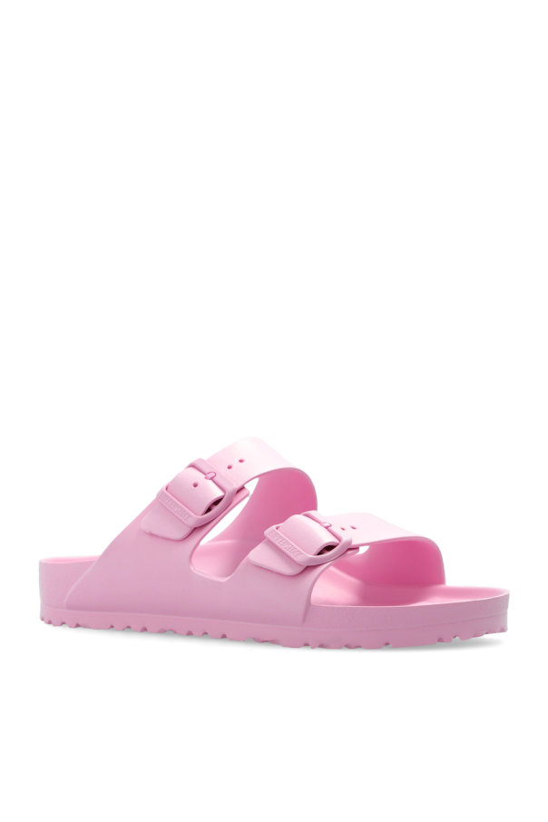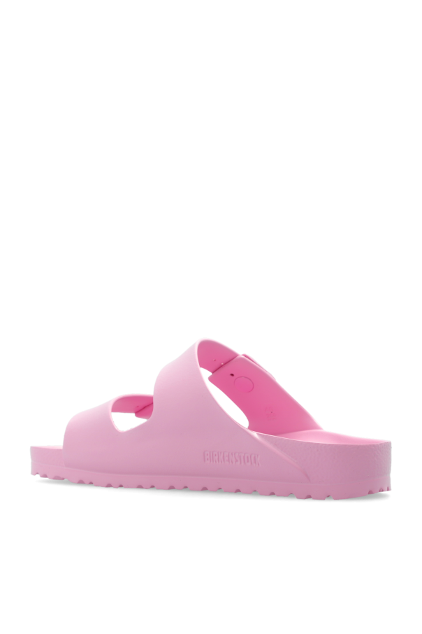 Pink ‘Arizona EVA’ slides from Birkenstock. Made of lightweight EVA foam, this pair features adjustable buckle straps, an embossed logo on the side, anatomically shaped narrow width cork-latex footbed and a pink EVA outsole.