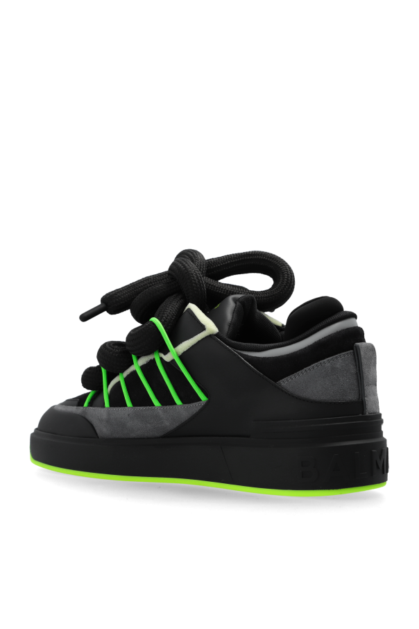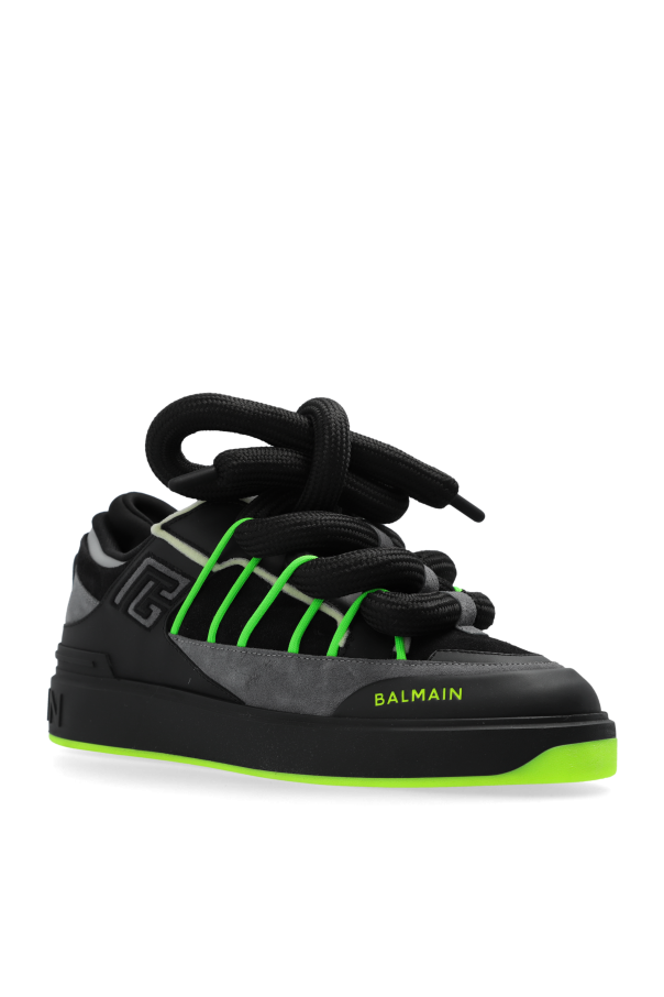 Discover the epitome of luxurious athletic footwear with the exclusive B-Court Puffy sneakers by Balmain. These men\'s sneakers exude a timeless, sporty silhouette complemented by a low-top design and feature a striking black colorway accented with vibrant green highlights. Crafted from premium synthetic and leather materials, these sneakers promise durability and a refined finish. The side of the shoe proudly displays the \"Balmain\" logo in a vivid green, alongside a stylized \"B,\" adding a touch of bold sophistication. The thick laces and embossed \"BALMAIN\" on the heel further enhance the unique character of these sneakers. The interior and lining of the shoe are meticulously crafted for maximum comfort, while the sole, made from high-quality rubber, offers excellent grip and stability. Reflective elements ensure visibility in low-light conditions, making these sneakers as practical as they are stylish. Why Choose These Sneakers? Iconic Design: Classic, sporty shape with a luxurious twist. Premium Materials: Combination of high-quality synthetics and leather. Comfort and Durability: Thoughtfully designed for long-lasting comfort and wear. Reflective Elements: Enhanced visibility for safety. Distinctive Branding: Features notable logos and embossed details.