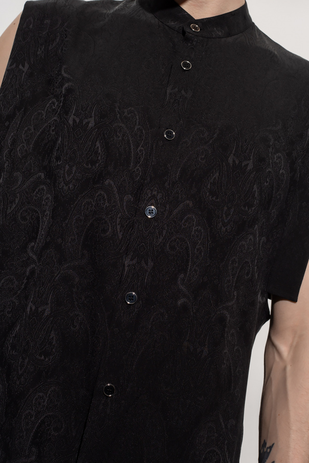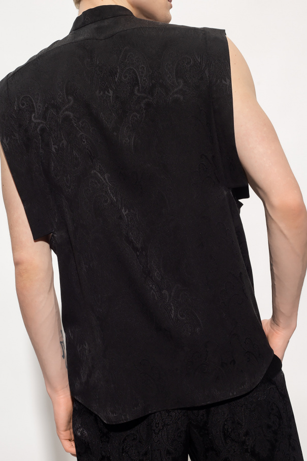 Black sleeveless shirt from Saint Laurent. Made of silk and decorated with a shimmering paisley motif, this style features button fastenings and a round neck.