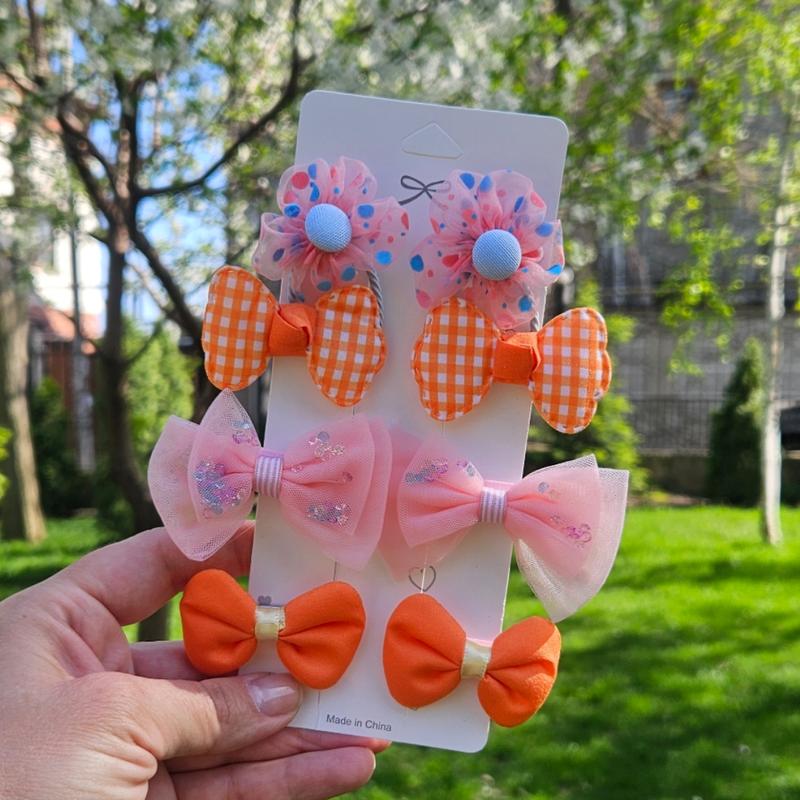 Яркий набор детских заколок/резинок для маленьких хвостиков. В набор входит 6 заколок и 2 резинки цветка (сверху) в оранжевом цвете. Заколки покрыты тканью, чтобы не повредить нежные волосы. Подходит для первых хвостиков.