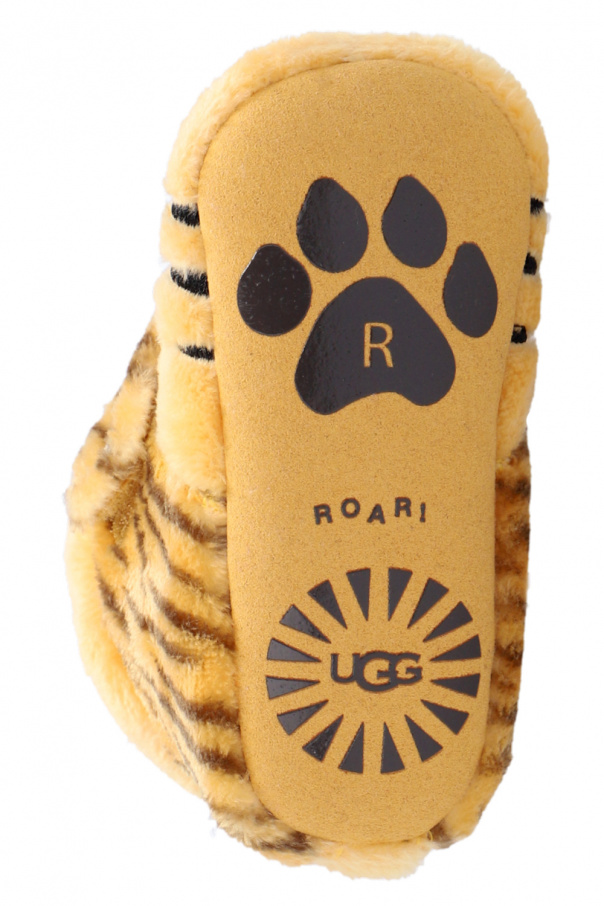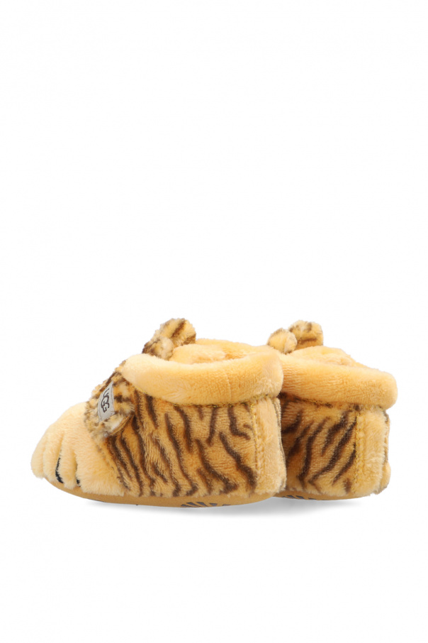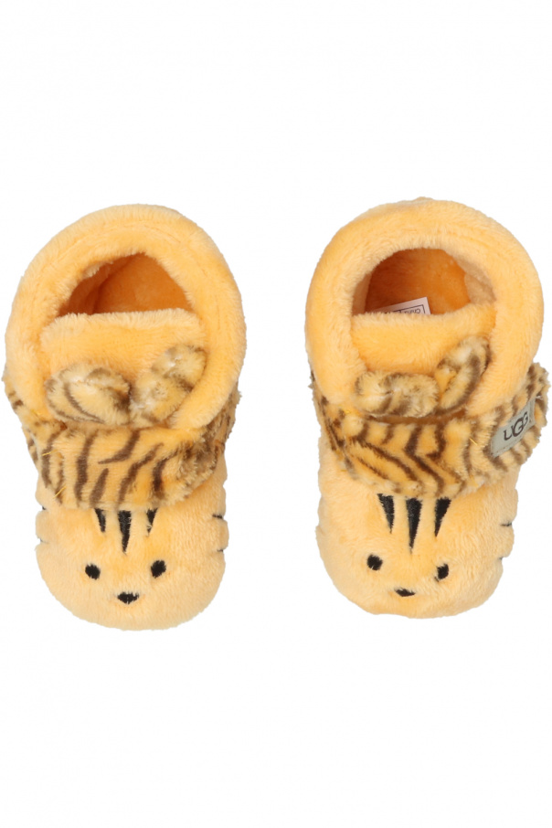 Yellowish-orange and brown ‘Bixbee Tiger Stuffie’ baby shoes from UGG Kids. Boasting a tiger motif, this model features a logo-patched velcro fastener and a microfiber outsole with a slip-resistant rubber print.
