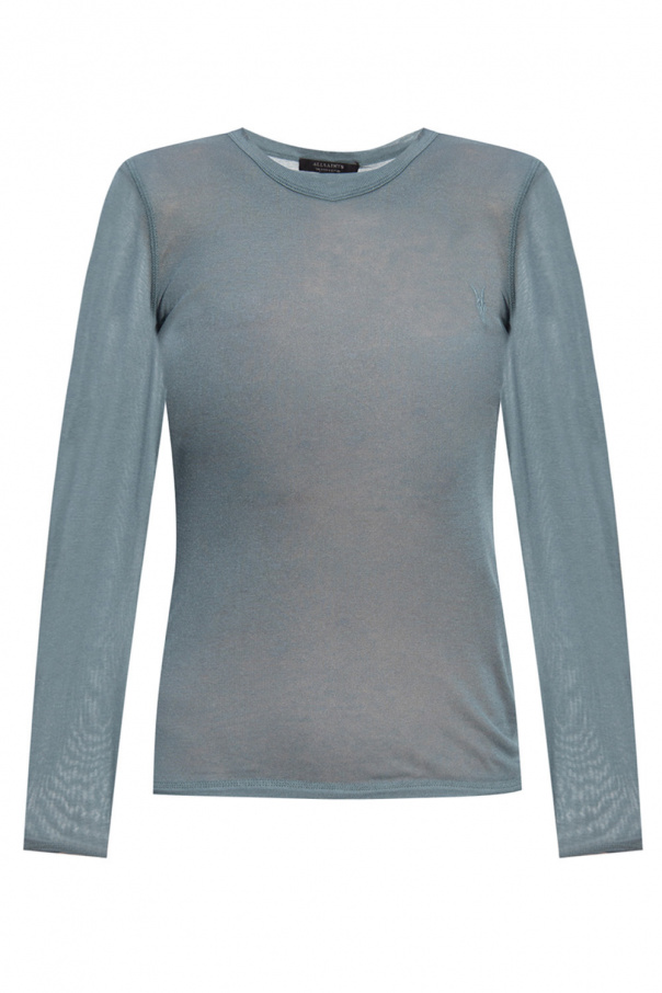 Blue and green ‘Francesco’ crewneck T-shirt from AllSaints. Crafted from modal, this style showcases long sleeves and an embroidered logo.