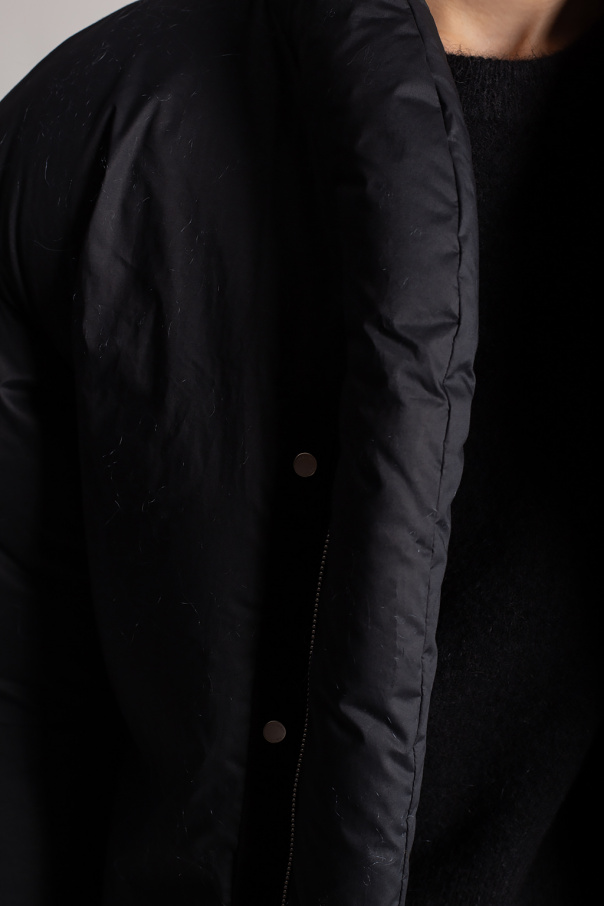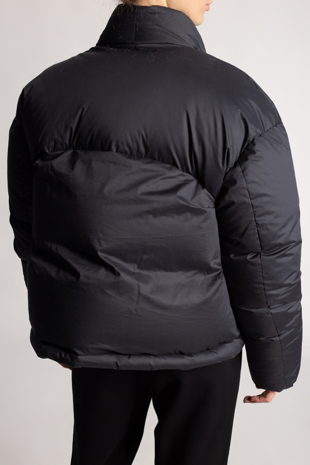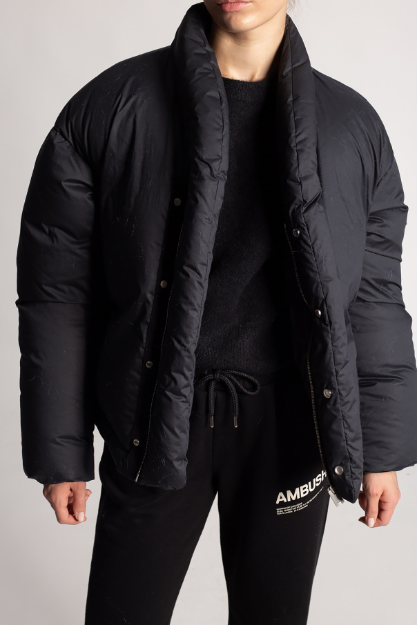 Black down jacket from Ambush. Fastened with a zip and snaps, this cotton-made model features a black and white logo patch, two front zip pockets, silver-tone metal hardware and long sleeves with ribbed cuffs.