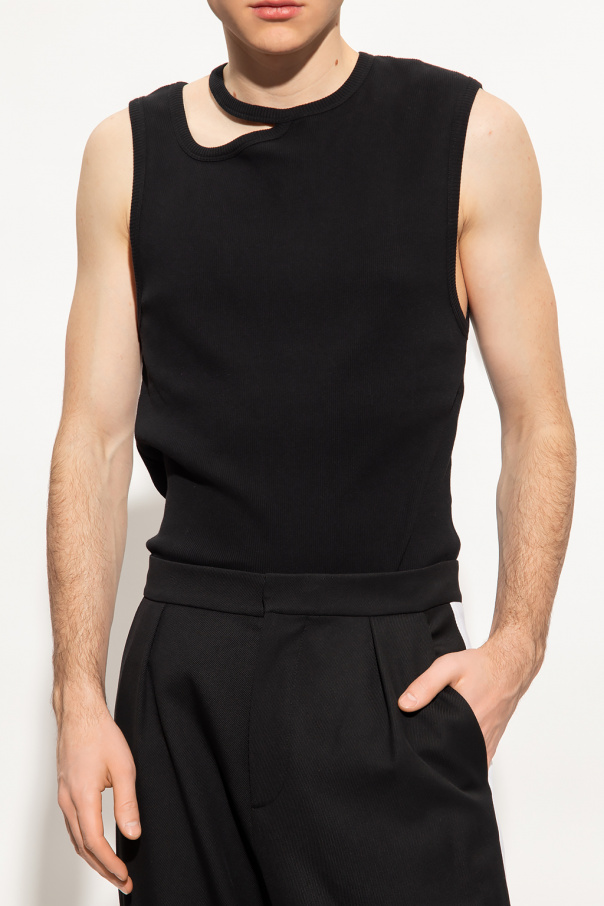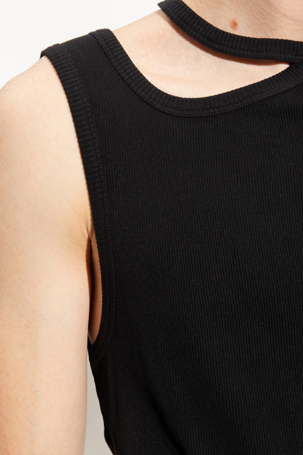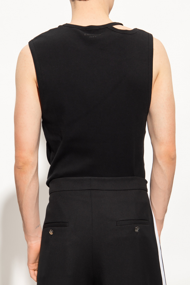 Black sleeveless T-shirt from Balmain. Crafted from cotton with a ribbed texture, this style features an elasticated collar and a cut-out detail.