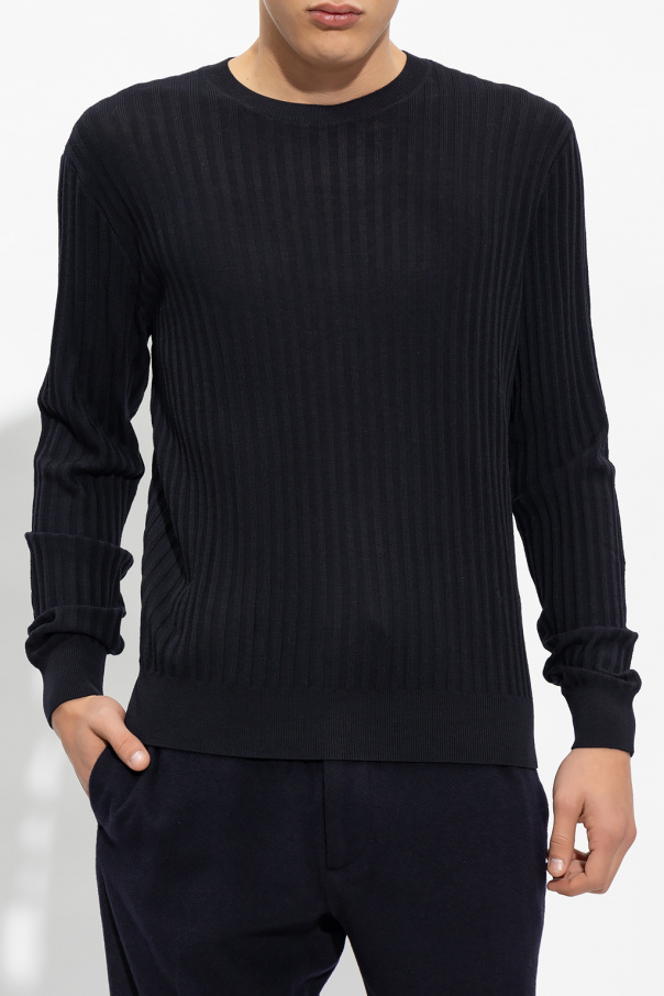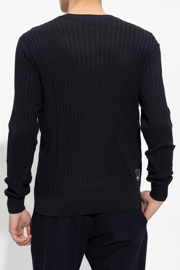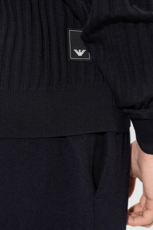 Black ribbed sweater from Emporio Armani. Crafted from wool, this garment is enriched by a logo patch and ribbed edges.