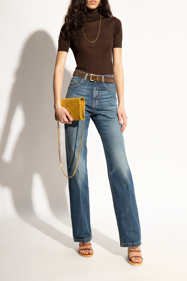 Brown and beige ‘Cassandra’ wedge shoes from Saint Laurent. Made of calf leather, this pair features an ankle strap fastening, logo detail and jute sole with leather trims.
