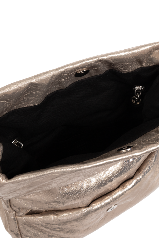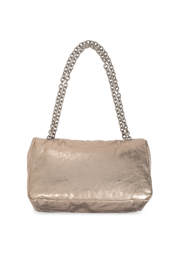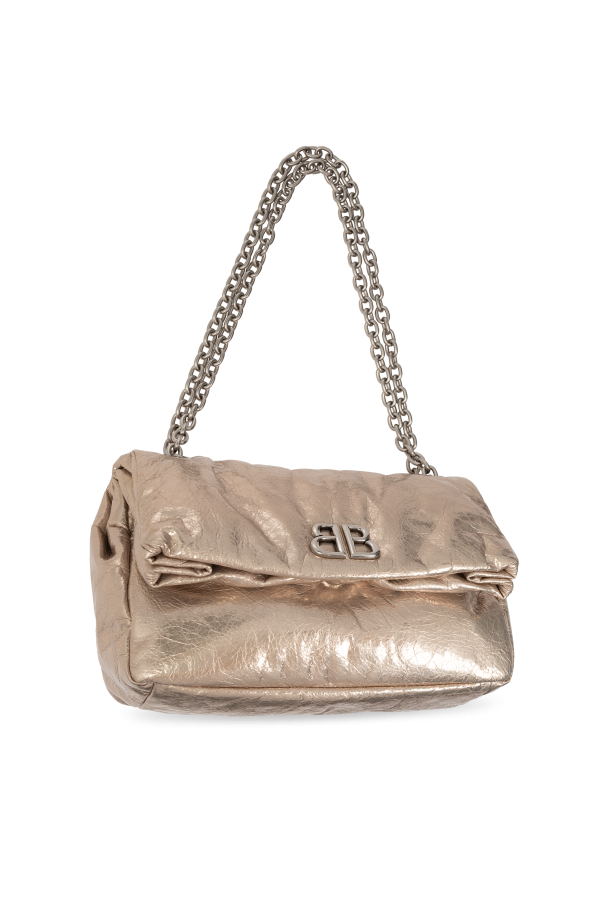 Introducing the Small Monaco Chain shoulder bag by Balenciaga, a manifestation of modern luxury and refined taste. Crafted from 100% calf leather with a captivating metallic finish, this flat purse shines in a radiant shade of light gold, offering an allure that is both sophisticated and enchantingly versatile. Its metallic hue, dynamic under varying lights and angles, adds depth and an intriguing effect to its overall appearance. The bag presents a sleek rectangular shape with gently rounded corners, embodying elegance with a touch of modernity. Its soft and slightly springy texture suggests ease of use, making it not only a statement piece but also a practical accessory for the discerning fashionista. The front is adorned with the iconic intertwined double \"B\" logo of Balenciaga, serving as a bold declaration of its distinguished lineage. Suspended on a substantial silver chain strap, the bag offers versatile carry options, comfortably fitting over the shoulder or across the body. Its interior, lined with smooth black fabric, features a main compartment and a slip pocket, ideal for organizing essentials. A magnetic flap closure gently secures the contents, adding a casual yet elegant flair to its design. Why Purchase This Product? Luxurious metallic finish in light gold, showcasing exclusivity and high fashion. Signature Balenciaga double \"B\" logo, emphasizing brand heritage and luxury status. Robust silver chain for stylish, versatile carrying. Functional interior with a main compartment and slip pocket for essential organization. Magnetic closure for secure, easy access.
