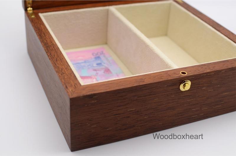 Червоне дерево мербау відноситься до елітної деревині. Вироби з нього мають гарний меднокрасный колір із золотистим відливом. Купюрница має два відділення для різних купюр. Можна використовувати для зберігання прикрас, інших цінних речей або сімейних реліквій. Використана врізна фурнітура та замок-кнопка . Внутрішня обробка світлої алькантарою. Зовнішній розмір 22*20*8 див. В наявності одне готове виріб. Під час виготовлення замовлення до 10 днів.